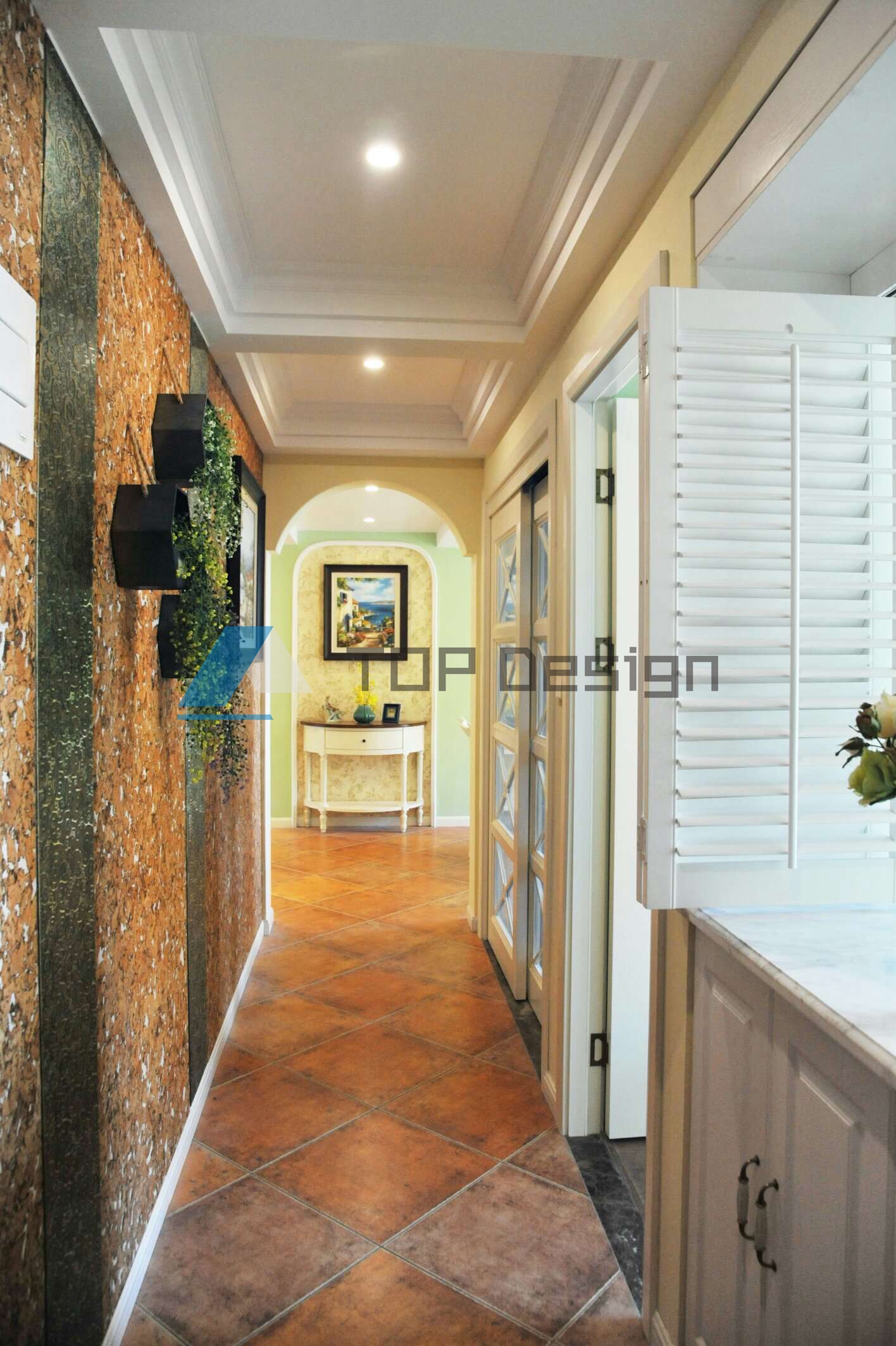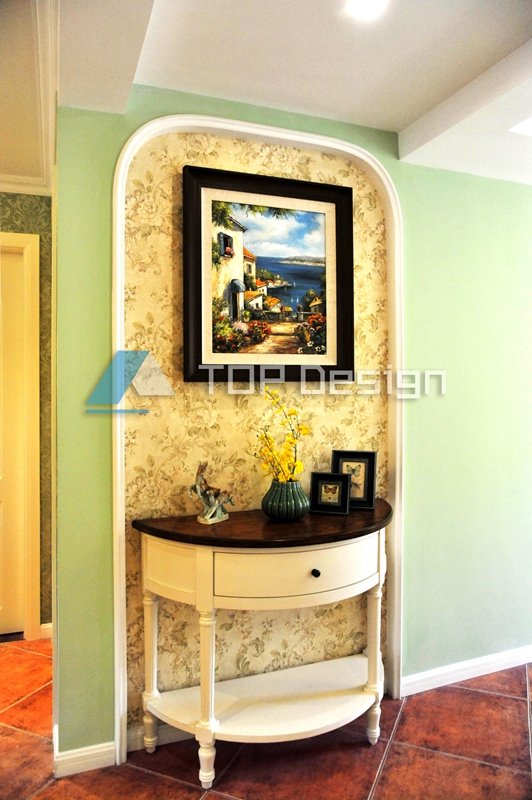 然光线,我们采用了百叶窗的形式使平时可以完全打开的状态增加借光的处理手法增亮过道空间,后期摆上小花瓶使进门的感受充满希望又温馨自然。