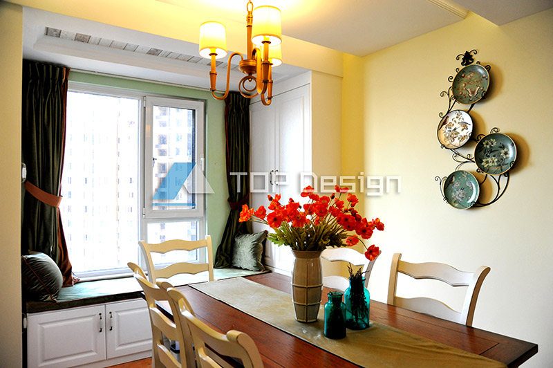 这样坐在餐厅可以观看到一线江景,舒适惬意。餐厅利用铜色的美式吊灯通过灯光和自然光的营造,烘托出一种清新、休闲、温馨、自然的居家体验。
