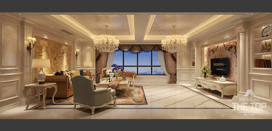 设计说明:本案欧式新古典主义的设计风格其实是经过改良的古典主义风格。欧洲文化丰富的艺术底蕴,开放、创新的设 计思想及其尊贵的姿容,一直以来颇受众人喜爱与追求。从简单到繁杂、从整体到局部,精雕细琢,都给人一 丝不苟的印象。一方面保留了材质、色彩的大致风格,仍然可以很强烈地感受传统的历史痕迹与浑厚的文化底 蕴,同时又摒弃了过于复杂的肌理和装饰,简化了线条。无论是家具还是配饰均以其优雅、唯美的姿态,平和 而富有内涵的气韵,描绘出居室主人高雅、贵族之身份。墙面的石材墙板和实木墙板装饰、水晶吊灯的点缀, 还有爱奥尼的石材柱、石材地面拼花也是此案的点睛之笔。