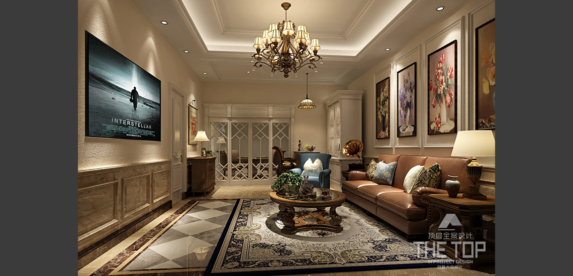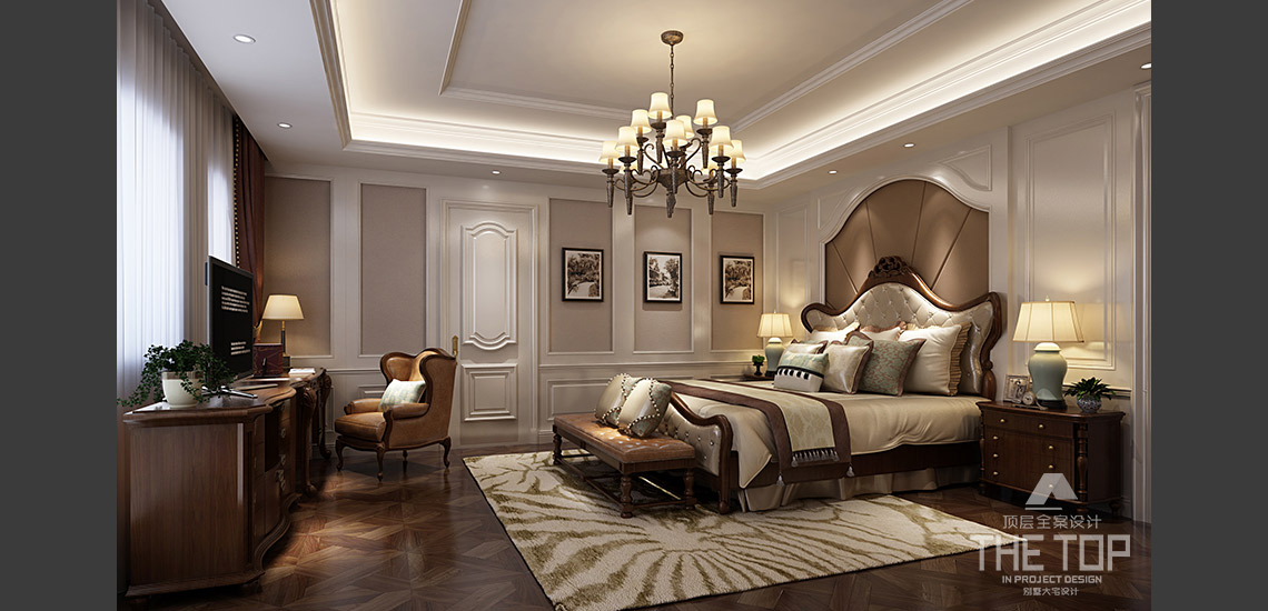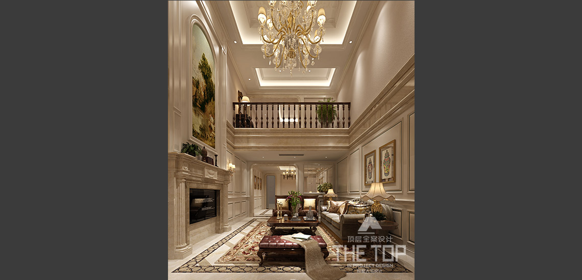 设计说明:本案系一套色彩淡雅的简约欧式混搭美式的设计风格,浅色的护墙板配合暖色的石材及墙纸,多种质地的材质 营造出典雅高贵的气质!色彩上虽然是一派高调的设计风格,但是设计师绝不是无脑的使用一个颜色,而是在 浅色系中游走,白色、浅色大理石等等,其中不乏穿插绿色、咖啡色等深色的色彩!这就是所谓的大面积协调 小面积对比的道理!在家具及软饰的选择上也十分配合硬装,最后融合在一起和谐自然、大气高雅。