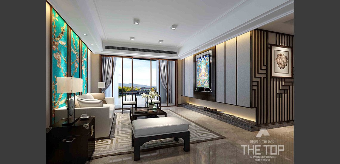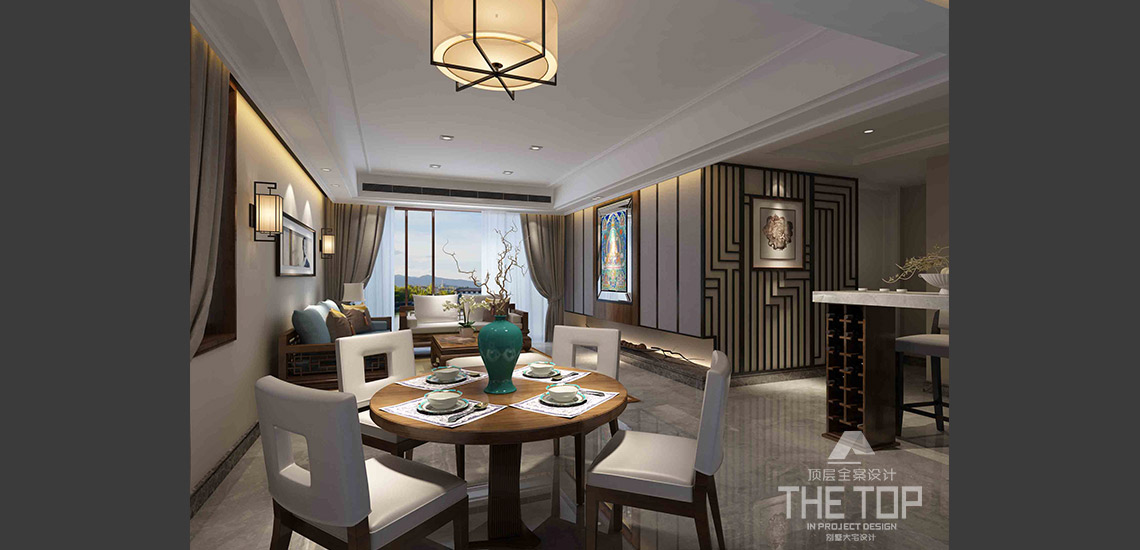 设计概念:本案客厅、餐厅比邻,开放式的结构提升了空间的纵深感。空间整体选用清雅的浅色调为主色彩,家具则以深 色木料为主,在清浅的大背景下,深浅的完美搭配,使空间整体色调显得安逸、和谐。规整的空间布局,横平 竖直的墙面木制线条,给空间增加了层次感。偌大的客厅阳台落地窗,阳光从落地的大窗子投射进来,幽蓝的 湖面,别有番诗情画意,给人“'偷得浮生半日闲”的美好感觉,吸引着你窝在沙发上慵懒一番。