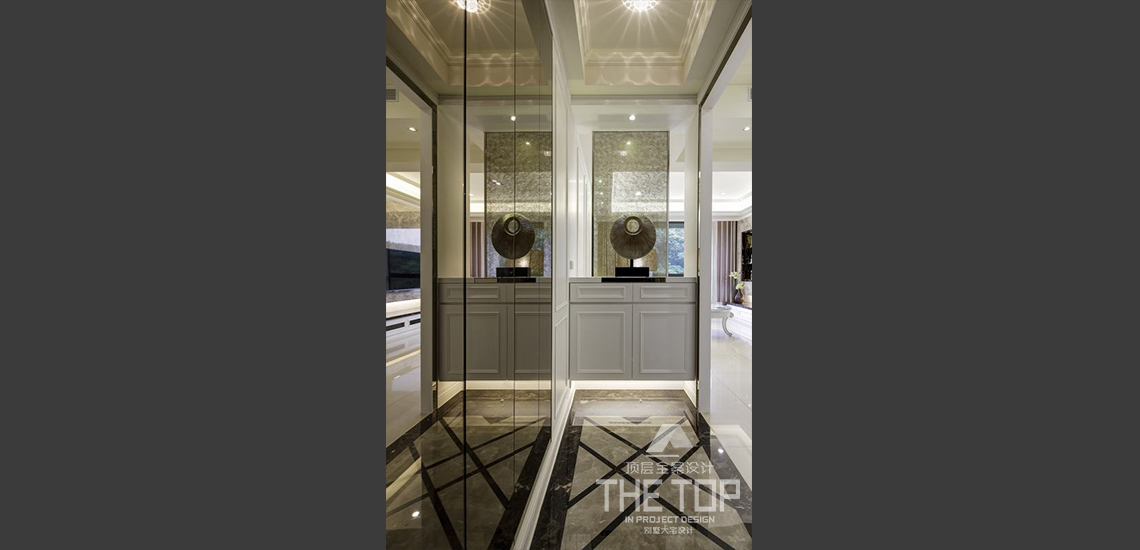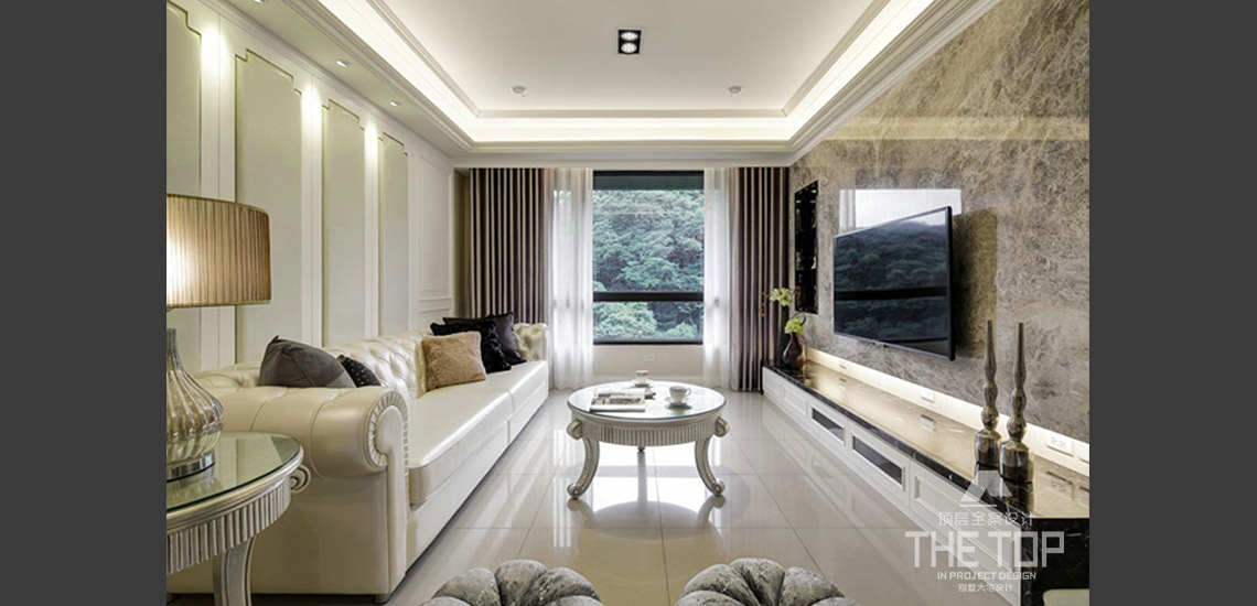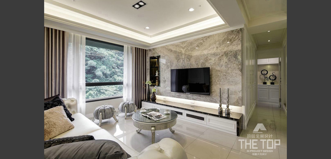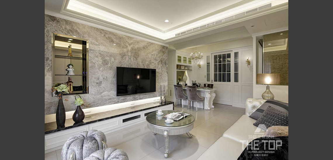 设计概念:此大宅整体风格定位为简欧风格,我们采用浅色为主基调搭配镜面整齐的大理石作为背景墙,意在为干净,大 气的时尚雅居。在整体空间上,我们利用线条的的简单造型处理,然后结合地面的是整体布局合理的比例分 配,再线条的美感和层次上做了精心的处理。在地面辅以简单的白色地砖,使其干净和简洁的地砖更好的融合 于整个空间,合二为一。沙发背景采用软包与木墙板的一个契合,在整体的感觉上有舒服和整体效果及档次的 提升。